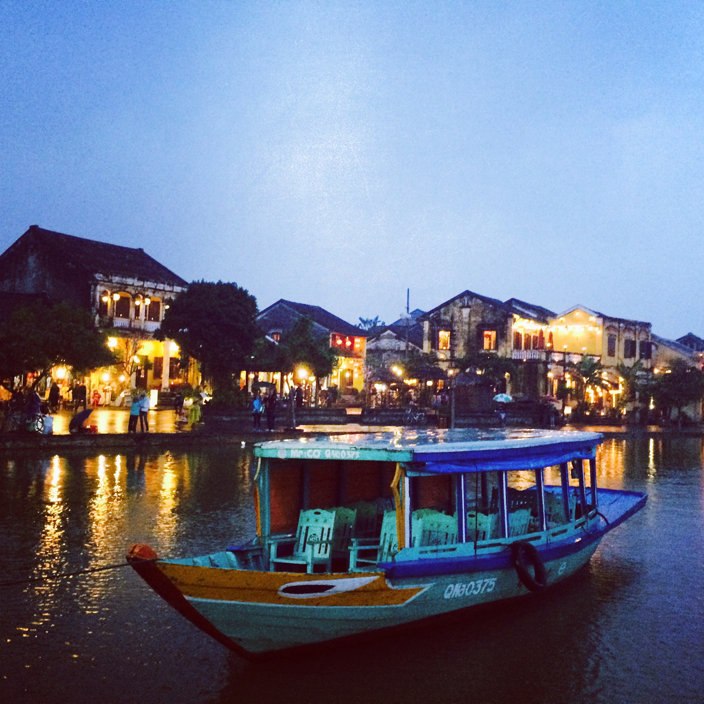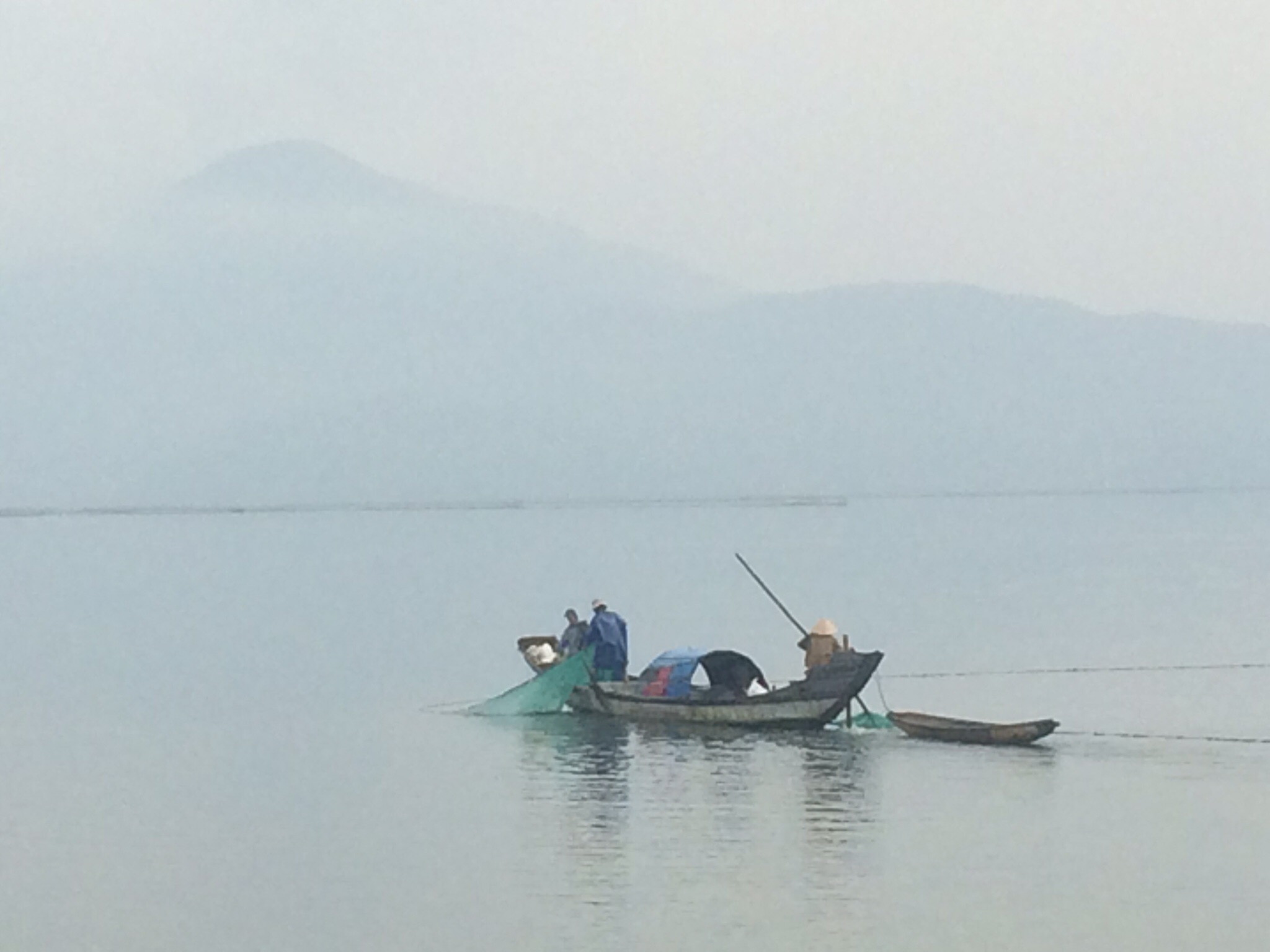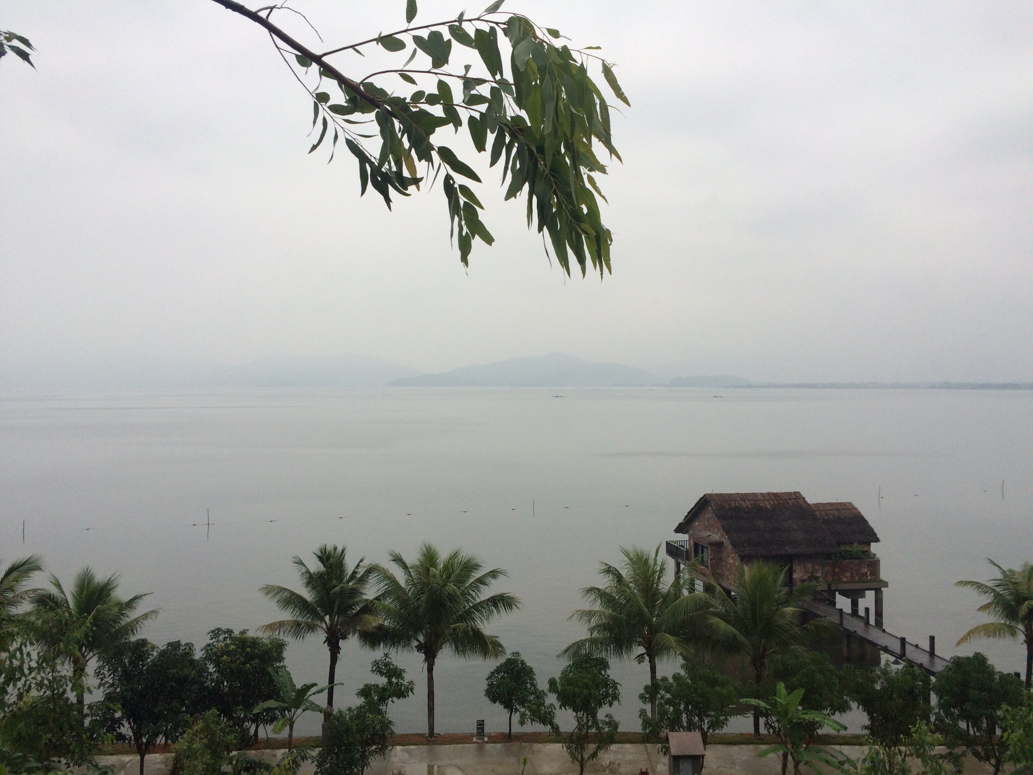 From Danang, we drive to Phu Loc, a rural district in the central coast region of Vietnam. On our way, we see the small Vietnamese towns, the agricultural fields, the sea, hills with Buddhas, and more. We are welcomed by massive amounts of non stop rain, and dark skies, overlooking the lagoon from the gigantic water villa. Compared to Hanoi, this feels like the end of the world, a beautiful tranquil place which, despite or maybe because of the weather, has a mystical feeling. From the terrace of the water villa, you can see the local fisherboats coming by, with the green hills covered in clouds in the background. Time for a few relaxed days, reading, running, eating, before heading on to Hoi An.